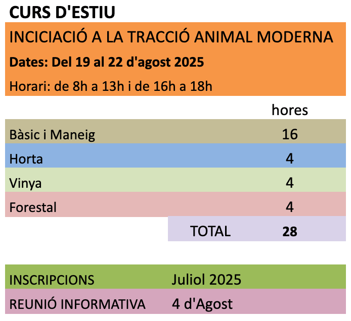 Per primera vegada, després de 3 edicions dels Curs Sencer, ens aventurem a oferir un curs d’estiu, que hem anomenat: INICIACIÓ A LA TRACCIÓ ANIMAL MODERNA.